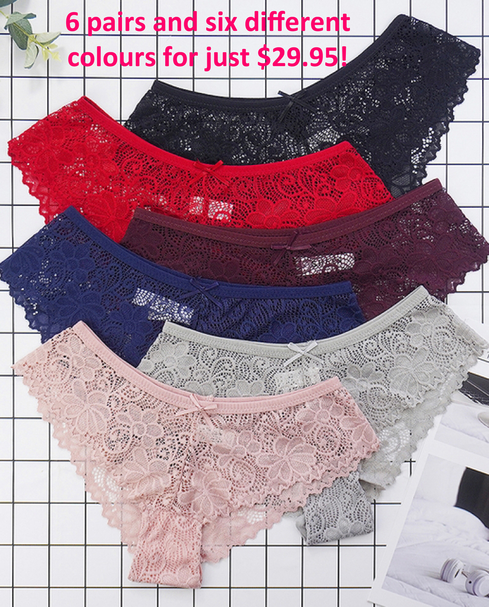 The pack contains six panties – one each of white, red, lapis, nude, black and ocean.